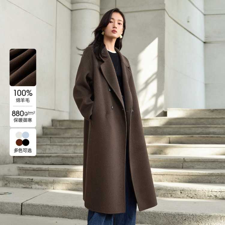 尚都比拉 【大衣女雙面呢100%羊毛】冬季西裝領長款毛呢外套女高級感